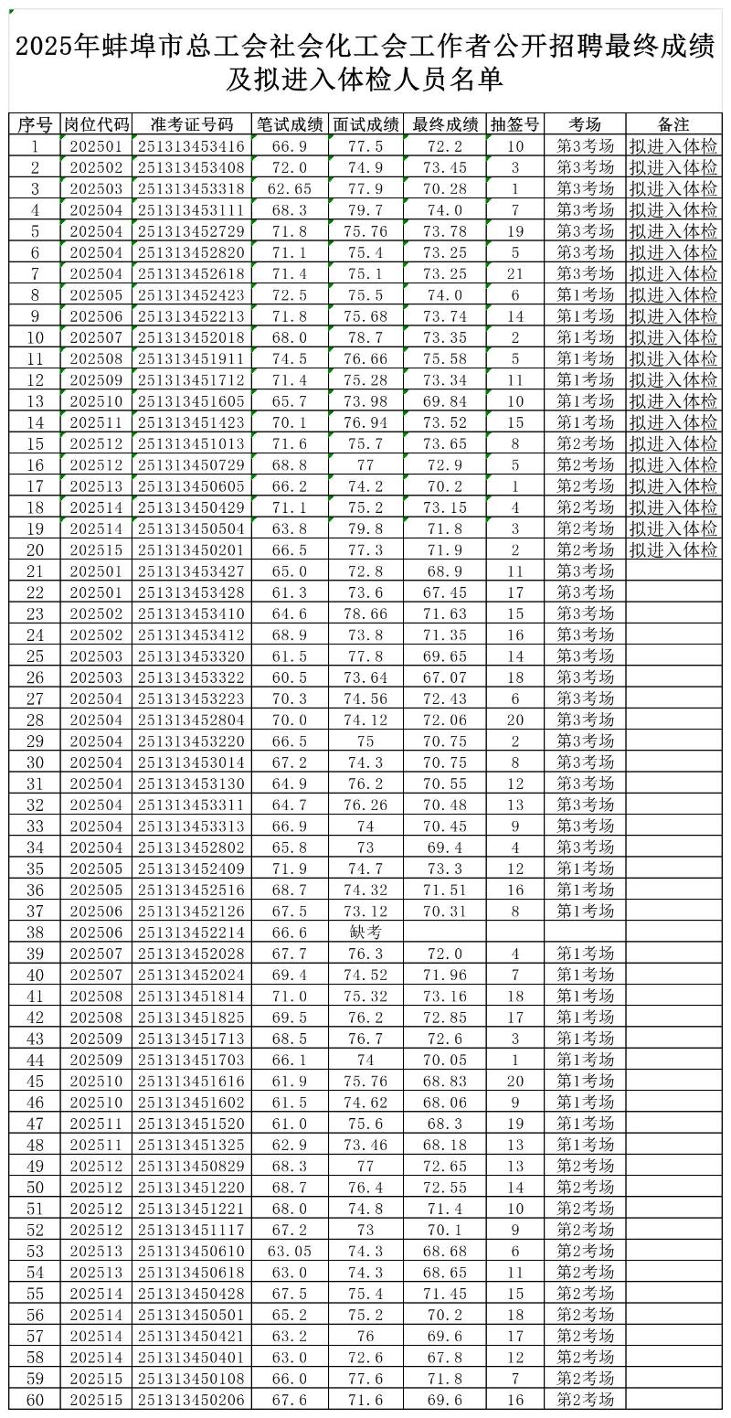 根据《2025年蚌埠市总工会社会化工会工作者公开招聘公告》相关要求,现将本次体检工作有关事项公告如下: